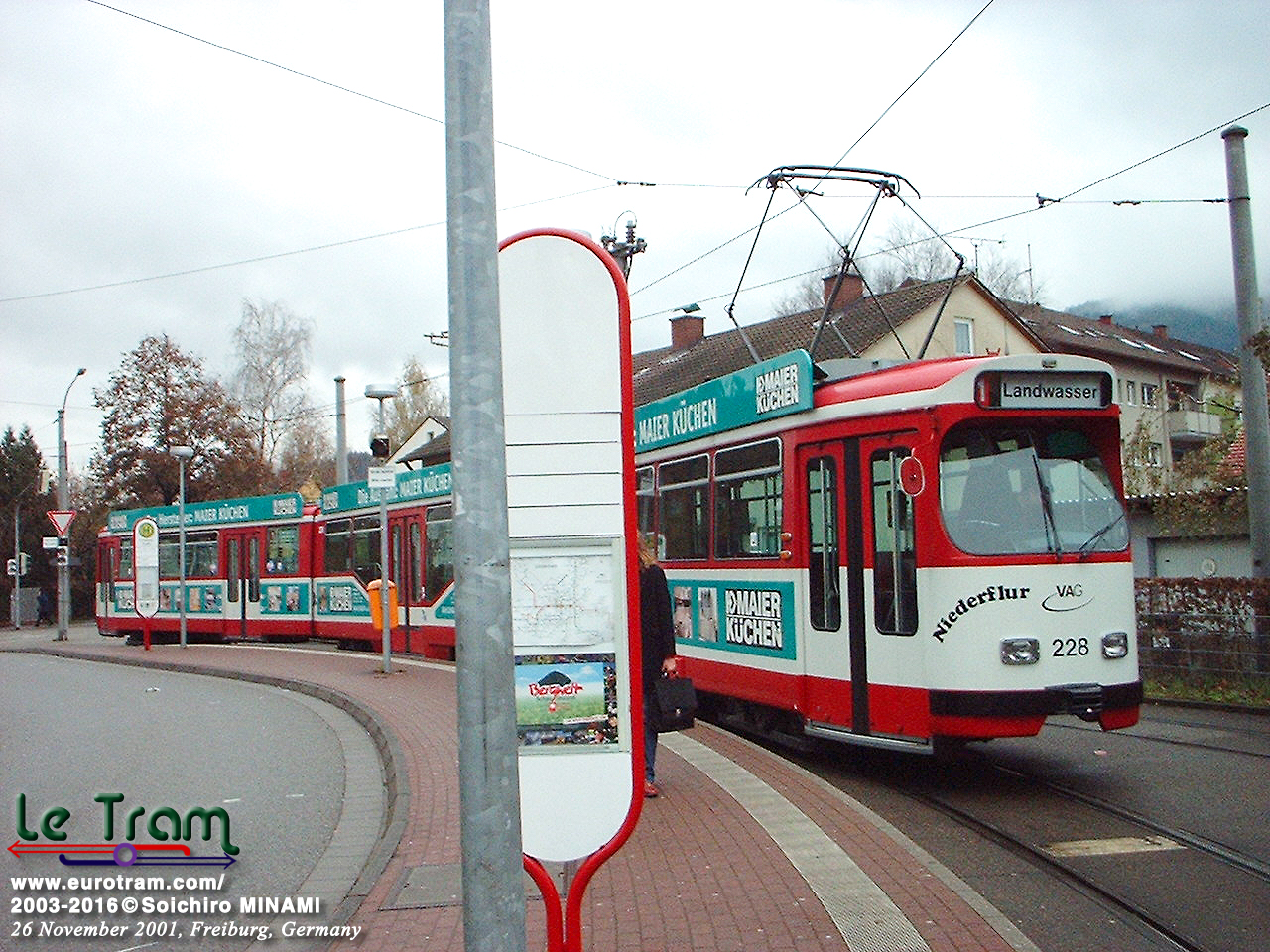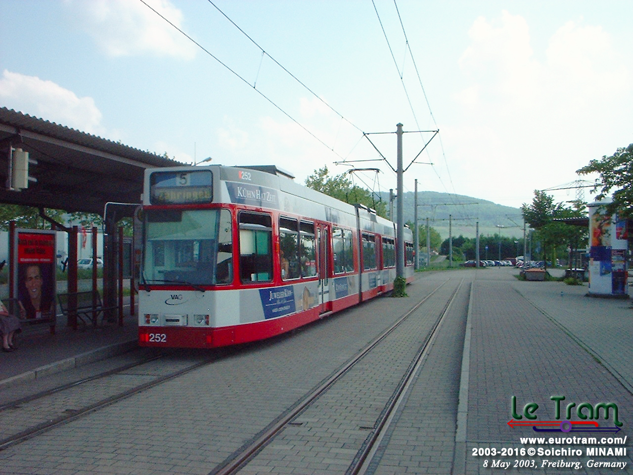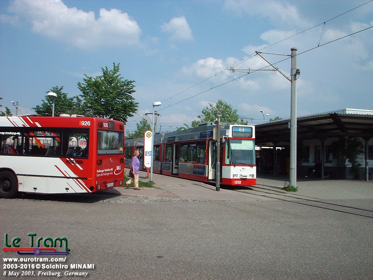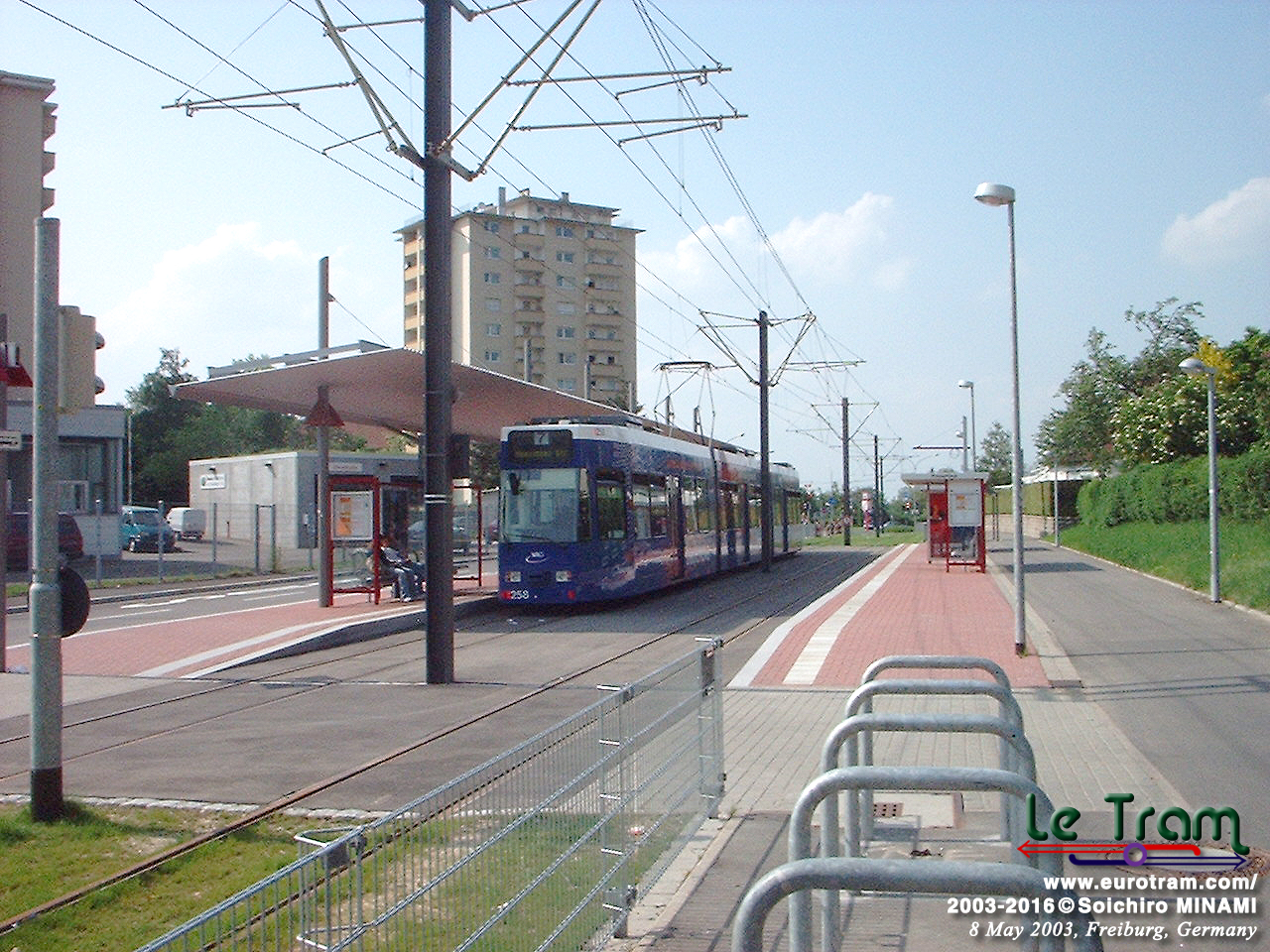 西の終点Munzinger Str.。ここはトラムの折り返しループ線の中にP&R駐車場とバスターミナルを設けた、交通の拠点となっています。この車両は1994年から登場した、フライブルク独自の低床車両。車輪幅の狭いフライブルクのトラムでは、当時の技術水準で台車部分の低床化は困難であったために、台車と台車の間だけ床を低くし、車内に段差を設けています。床面積のおよそ半分をノンステップにすることができ、車いすの人は何の問題もなく乗車できるようになりました。(2003/5/8) |