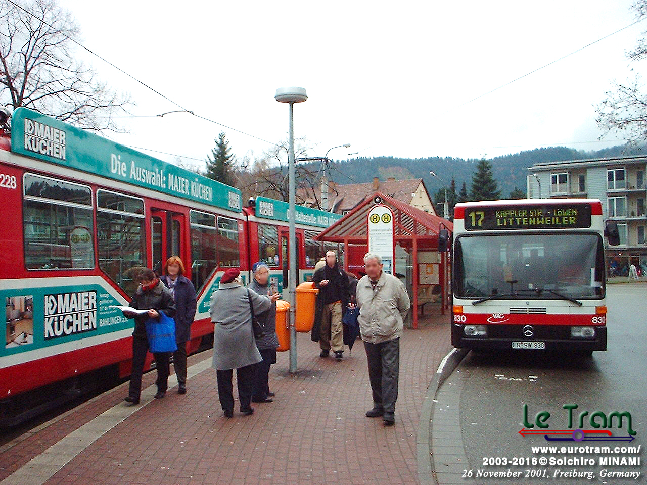 Lassbergstr.停留所におけるバスへの連絡。ここより奥へはバス接続となります。単に向かいに止まっていて接続が便利なだけではなく、1枚の乗車券で乗り継ぎができるようになっています。(2001/11/26) |