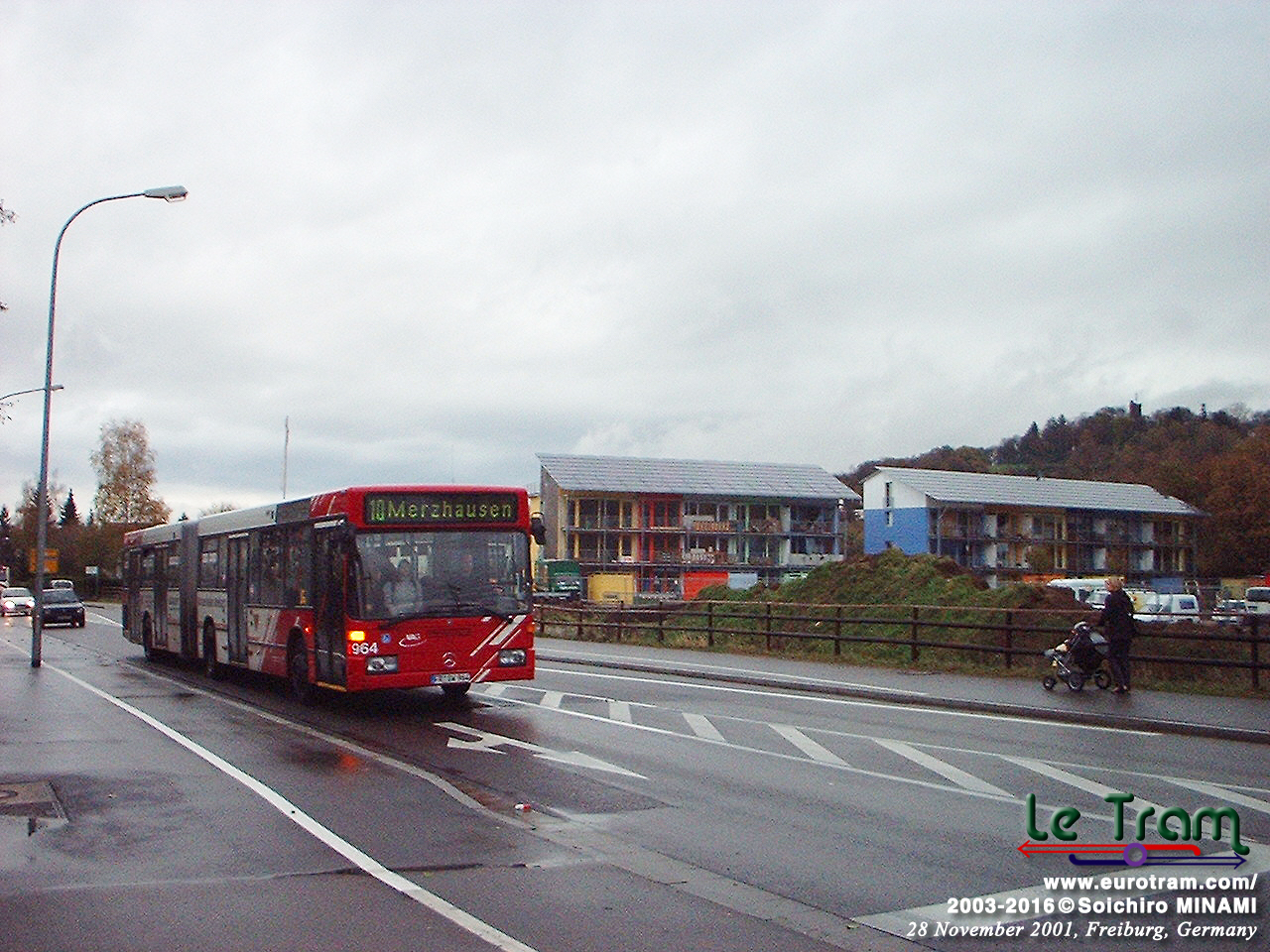 市南部のVauban地区を走るバス。Vauban地区は元は仏軍駐留地であり、返還にさいしてエコタウンとして再開発されました。ログハウス風の家屋がエコを象徴するとともに、屋根には太陽光パネル。この地区では、「自動車は気候の破壊者である」という落書き!すらあり、エコロジスト団地みたいな雰囲気が漂っています(2001/11/28)。なお、ヴォーバン地区には2006年にトラムが延伸されました。この写真の道路にもトラムが走っています。今のヴォーバン地区の様子はアルバムその5をご覧下さい。