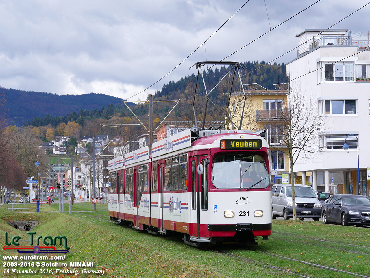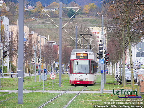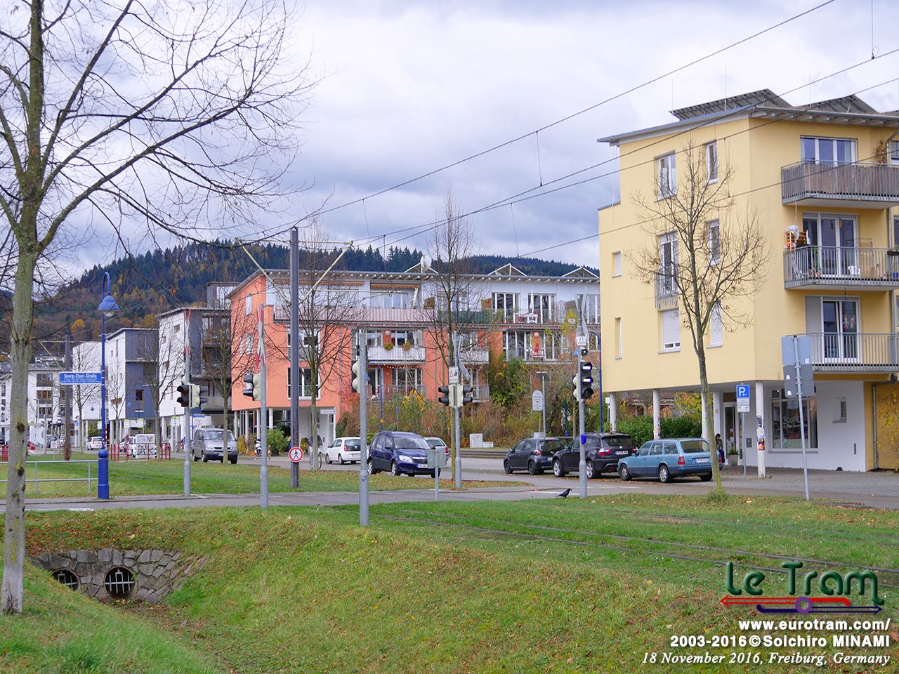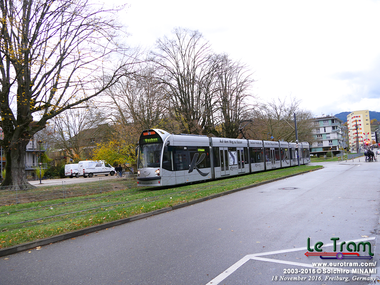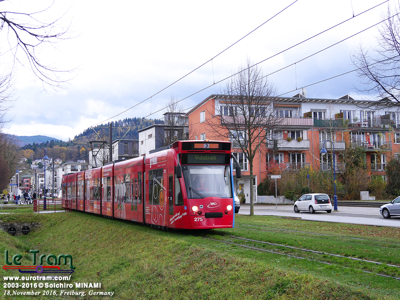 | 団地内の緑地帯を快走するGT8Z形トラム。黒い森に抱かれたフライブルクだと、芝生軌道のおかげで緑豊かな町に見えます(2016/11/19)。 |