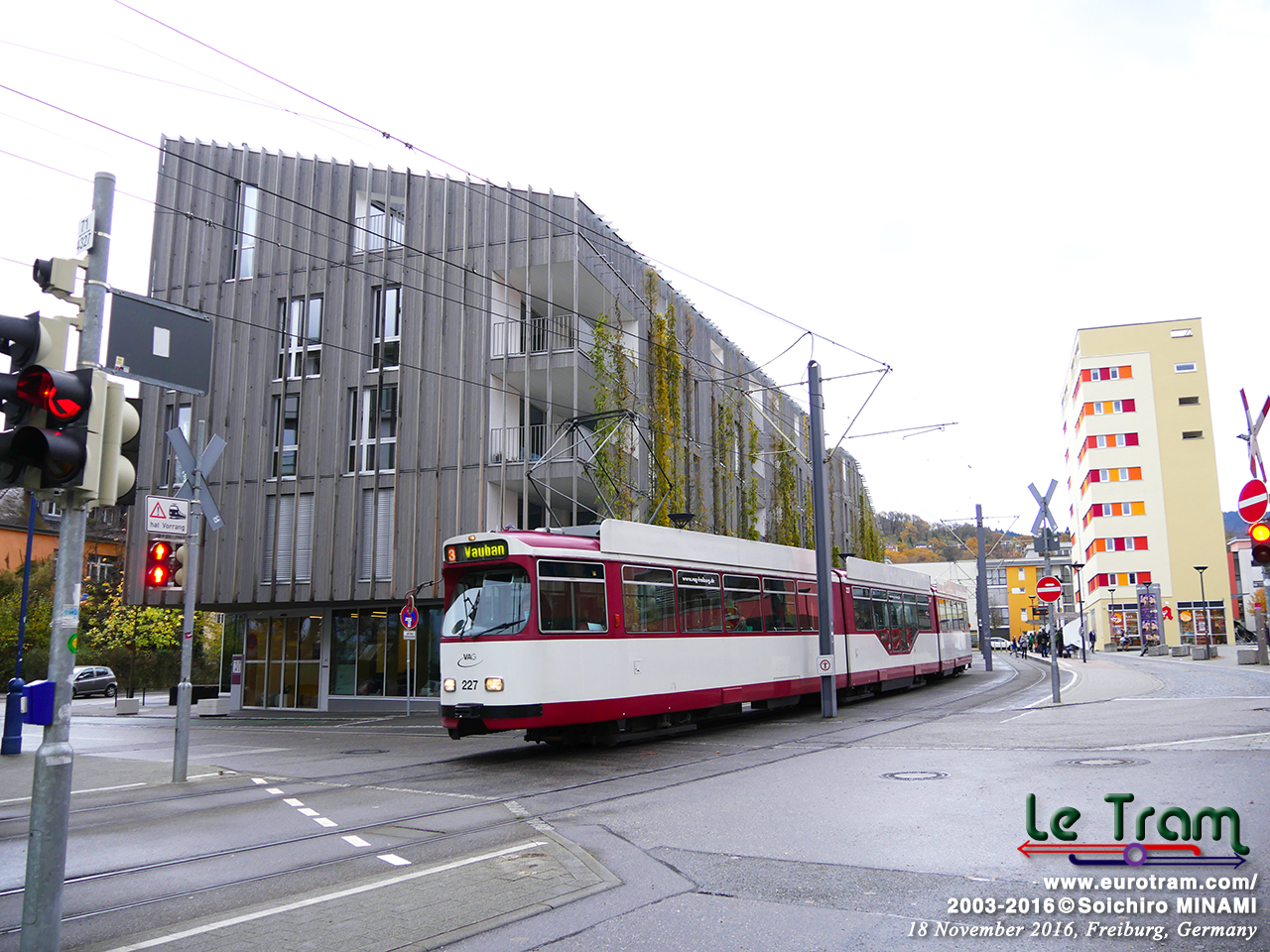 Vauban地区の入り口、P.-Modersohn-PL停留所。背景の建物も、壁面緑化されたエコ建物です(2016/11/18)。 |