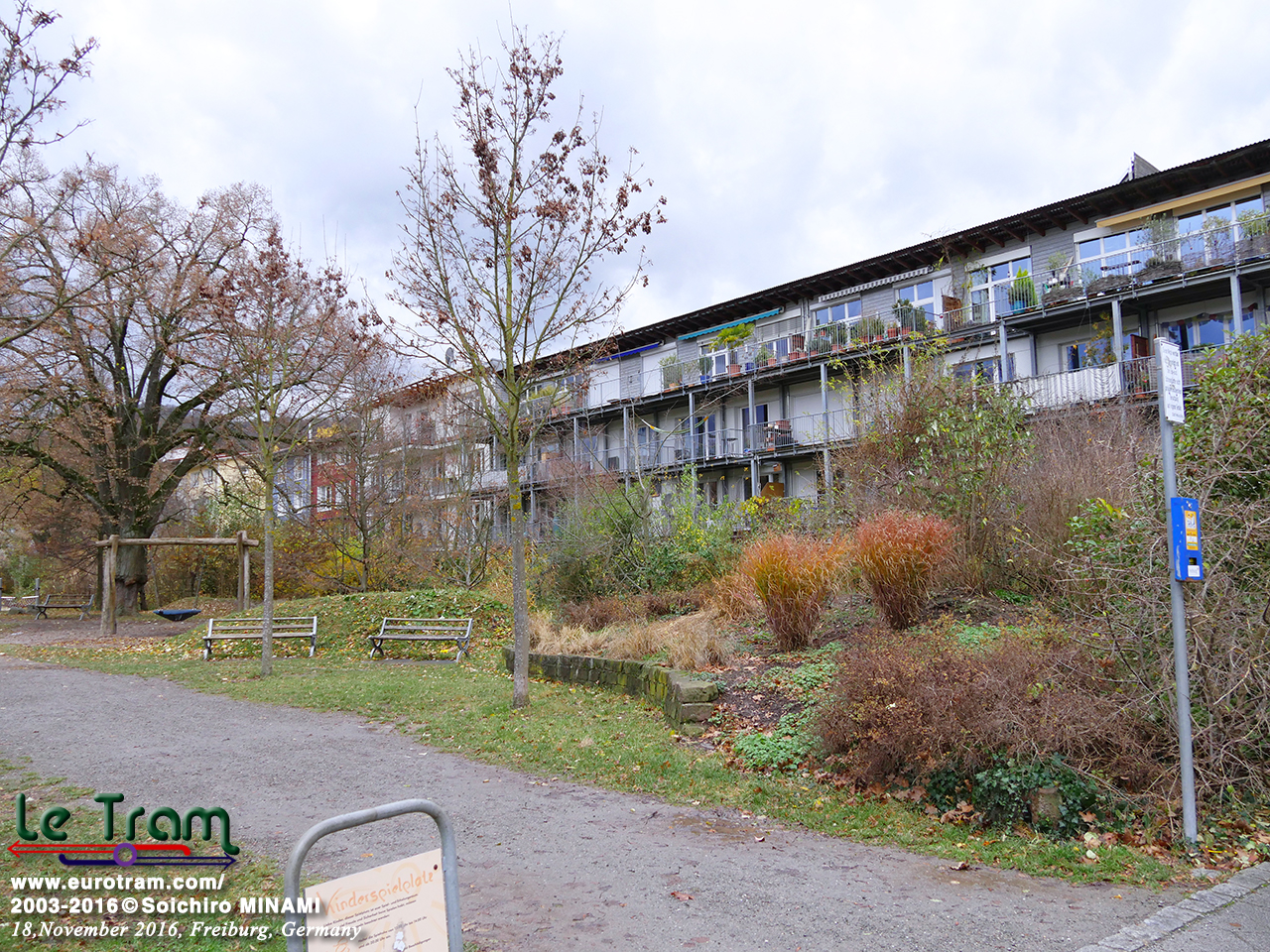 ヴォーバン地区の中央部は、芝生軌道を利用した緑地帯となっており、軌道にそって水路が掘られ、ビオトープの役割を果たします。Vauban-Mifte〜Innsberucker Str.間(2016/11/19)。 |