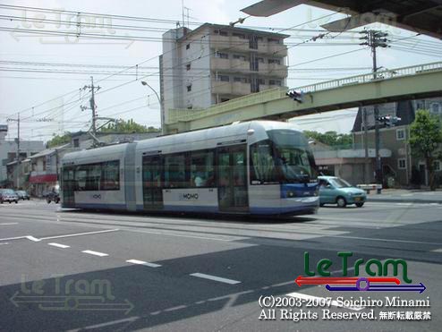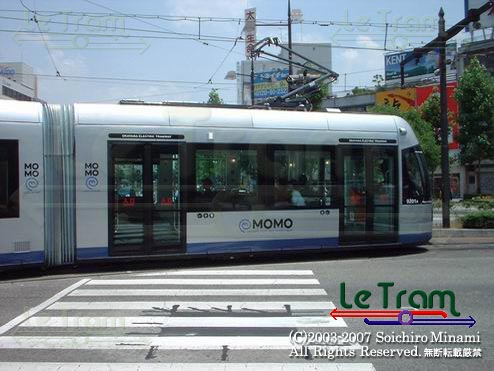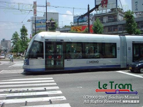 門田屋敷付近をゆくMOMO。連接車になり在来車よりも少し長くなりました。(2002.6.8) |