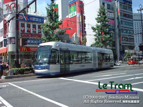 岡山駅前。何よりも背景がちょっとケバすぎます。車両デザインではヨーロッパのどのトラムにもひけを取らないMOMOですが、周辺の景観がこれでは泣きます。ヨーロッパのトラムだと形のいい石造りの家がバックになるのですが。この写真にも写っている某ファースト・フードチェーン店、例えばフライブルクではこういう風にしているので、日本でも見習って欲しいものです。(2002.6.9) |