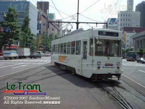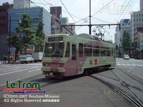 岡山駅前のポイントを通過するトラム。写真手前側は乗車ホーム(終点側)で、降車はポイントの手前の専用ホームで行います。(2002.6.8) |