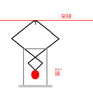 岡電式パンタグラフ岡電式パンタグラフの仕組みです。一見台座の上に小型の普通型パンタグラフを載せているように見えますが、実は下枠は台座の下まで伸びており、台座の中で交差しています。その下に錘がぶら下がっています。この錘でパンタグラフの枠全体を上下に伸ばして、パンタを上昇させているのです。 |