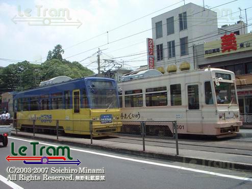 終点の東山の停留所にて。東山に岡電の本社ならびに工場・車庫があります。(2002.6.8) |