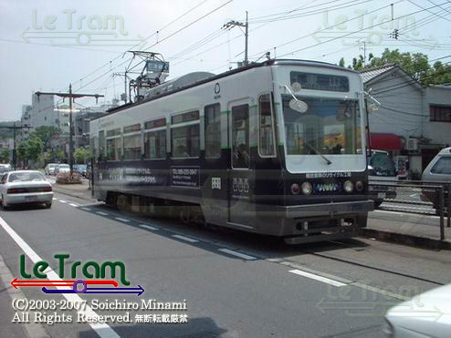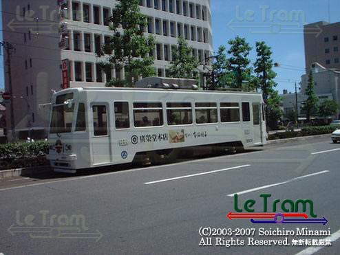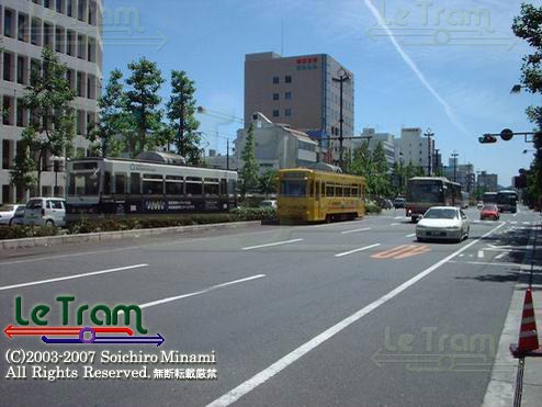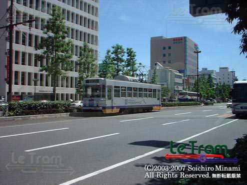 岡山駅前からまっすぐ伸びる桃太郎大通りをゆくトラム。この区間はセンターリザベーション方式で自動車車線と完全に区切られており、かつ都心景観に配慮したセンターポール式の電柱を採用しています。(2002.6.9) |